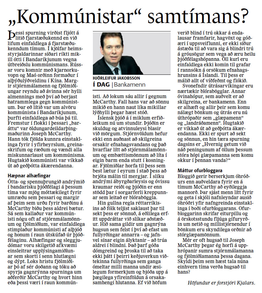 Hjörleifur líkir þessum illa innrættu gagnrýnendum auðjöfra og bankamanna við McCarthy, sem sá kommúnista í öllum hornum og ýmist svipti blásaklaust fólk lífsviðurværinu, útskúfaði því úr samfélagi manna eða hrakti það út í dauðann. Hann áttar sig ekki á því að nú er þessu öfugt farið þar sem græðgi, svik og prettir auðjöfra og bankamanna hafa svipt þúsundir atvinnunni og nú þegar hrakið nokkra örvæntingarfulla Íslendinga út í dauðann. Hjörleifur fær pláss fyrir þessa varnarræðu sína við hlið leiðara Fréttablaðsins í dag, það dugar ekkert minna.